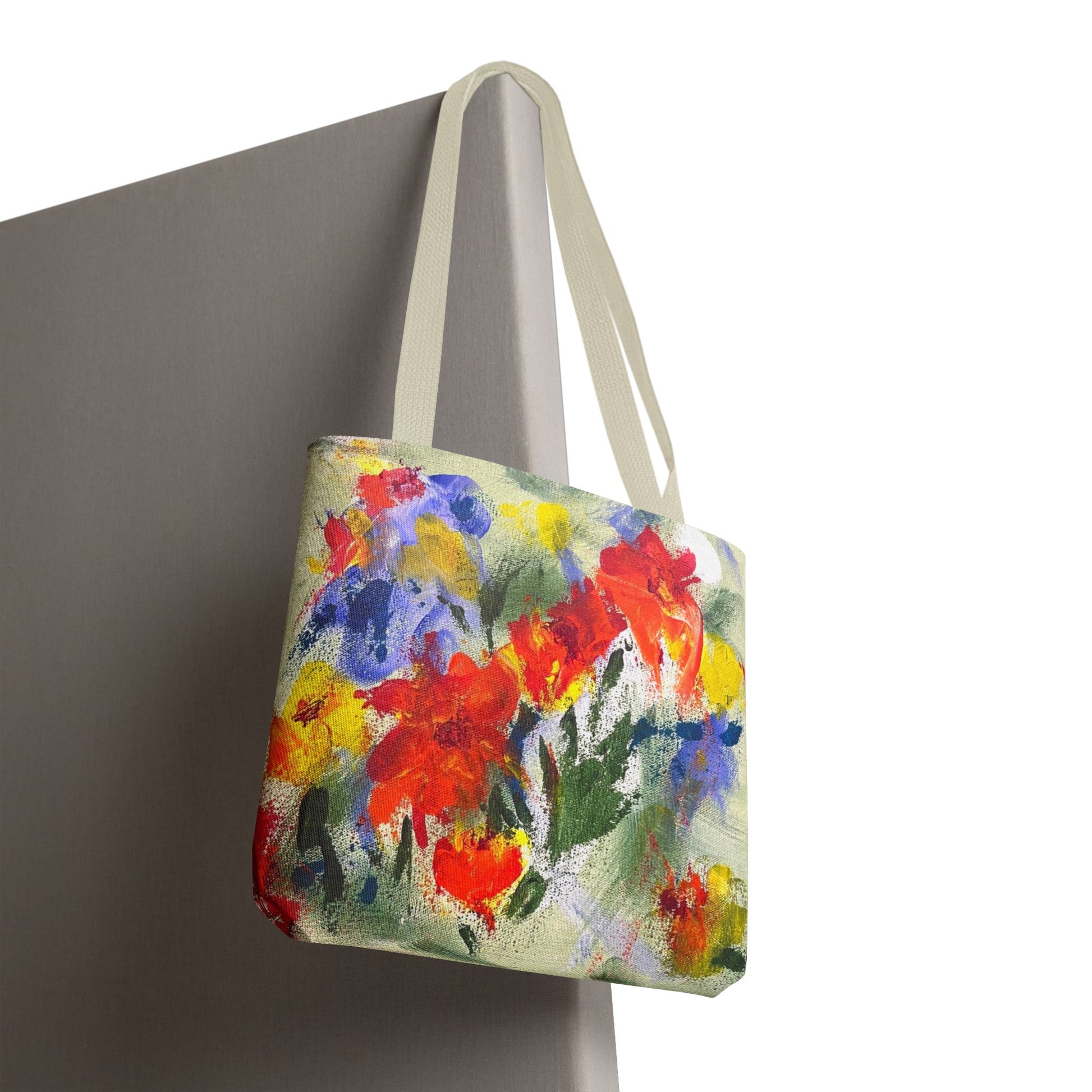 Vibrant and colorful tote bag featuring my abstract floral artwork called Through the Garden. The oranges and green are perfect for adding a pop of color to your everyday outfit.
