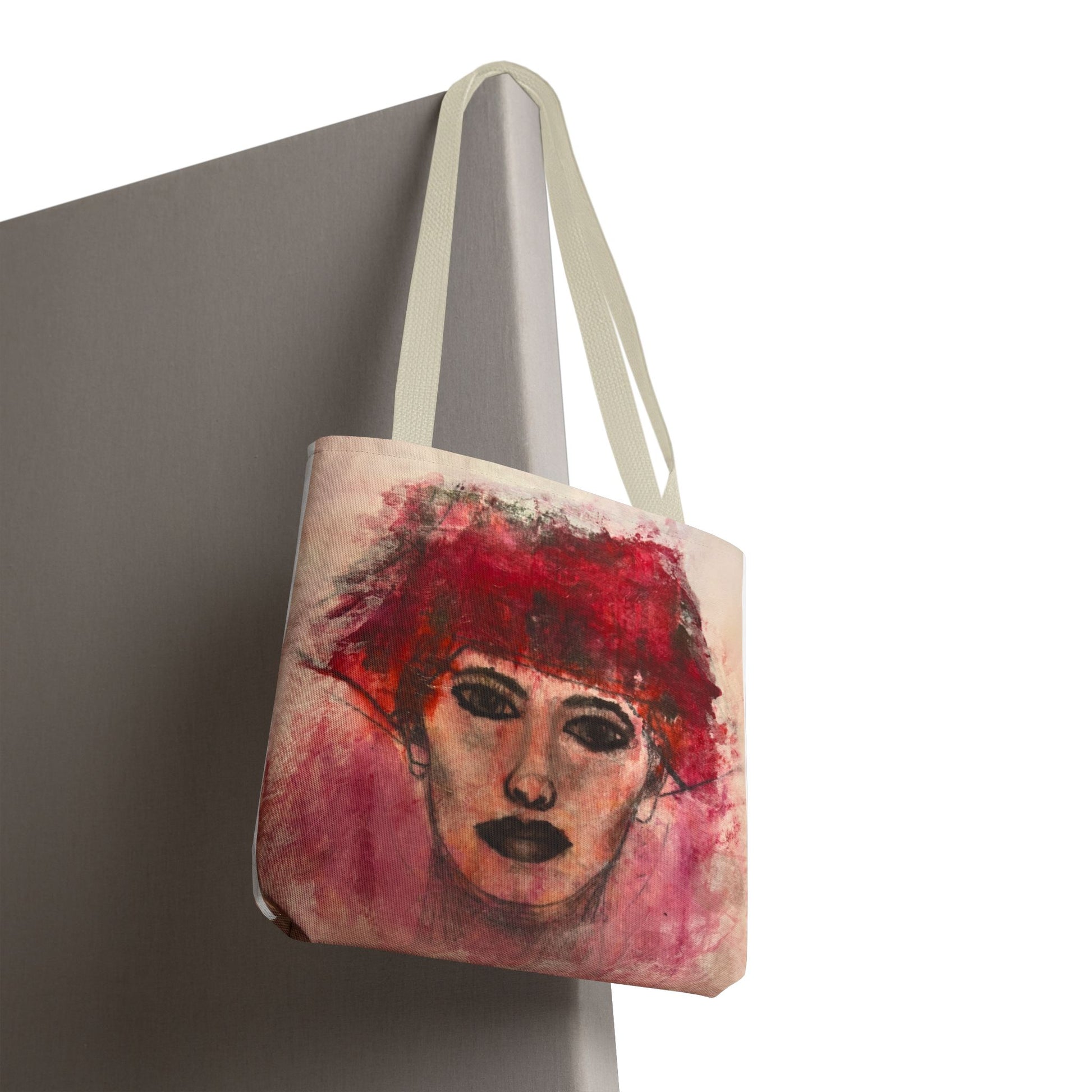 Unapologetically Herself - Carry a bit of bold beauty wherever you go. This tote features my original mixed-media portrait, layered with rich reds and soft pinks that create a sense of mystery and quiet strength. Sturdy, spacious, and artful—perfect for everyday errands, studio days, or simply expressing your unique style.